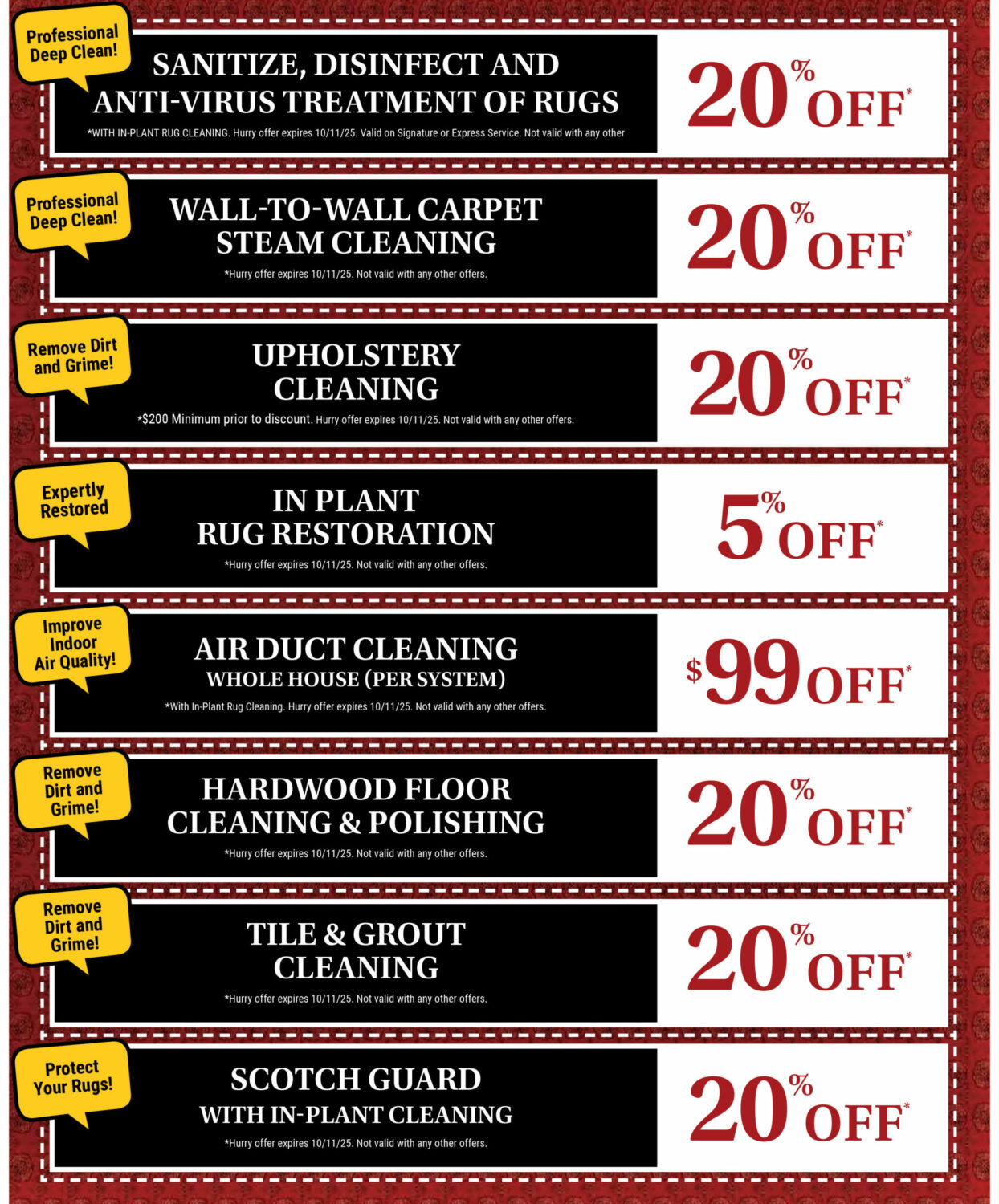 This October, enjoy special savings on our rug cleaning, home cleaning, and office cleaning services! Whether you’re refreshing your living space or maintaining a professional work environment, our team delivers spotless results you can count on. Contact Hadeed Mercer Rug Cleaning today to schedule your October cleaning special!